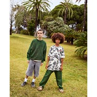 Groene sweater van zacht biologisch katoen met ribboord rond de hals, mouwen en onderkant. De sweater is oversized en heeft een verwassen effect wat zorgt voor verschillende groene kleuren.