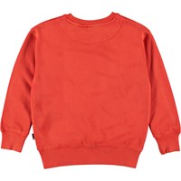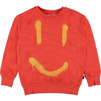 De hoofdkleur is een oranje unisex trui met op de voorkant een print van een groot smiley-gezicht.