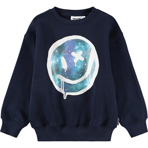 Donkerblauwe sweater gemaakt van zacht biologisch katoen met een grote print van een met spuitverf beschilderd lachend gezicht. De sweater heeft een oversized pasvorm met ribboorden rond de hals, mouwen en taille.