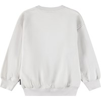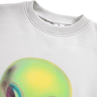 Grijze sweater gemaakt van zacht biologisch katoen met een grote print van een groene alien. De sweater heeft een oversized pasvorm met ribboorden rond de hals, mouwen en taille.