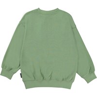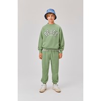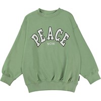 Mar is een groene unisex trui met op de borst de geborduurde tekst ‘Peace Now’. De lengte van de trui is lang. Draag de trui met de bijpassende short.