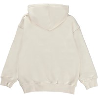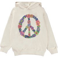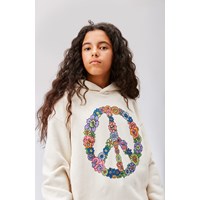 Matt is parelmoerkleurige unisex hoodie met op de voorkant een print van een vredesteken die gemaakt is van bloemen. De hoodie heeft een buidelzak aan de voorkant en rijboorden rond de mouwen en onderkant. Dit product is Oek-Tex gecertificeerd.