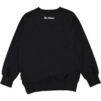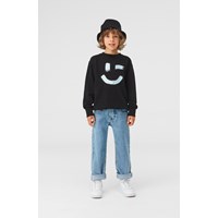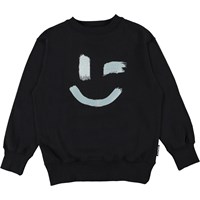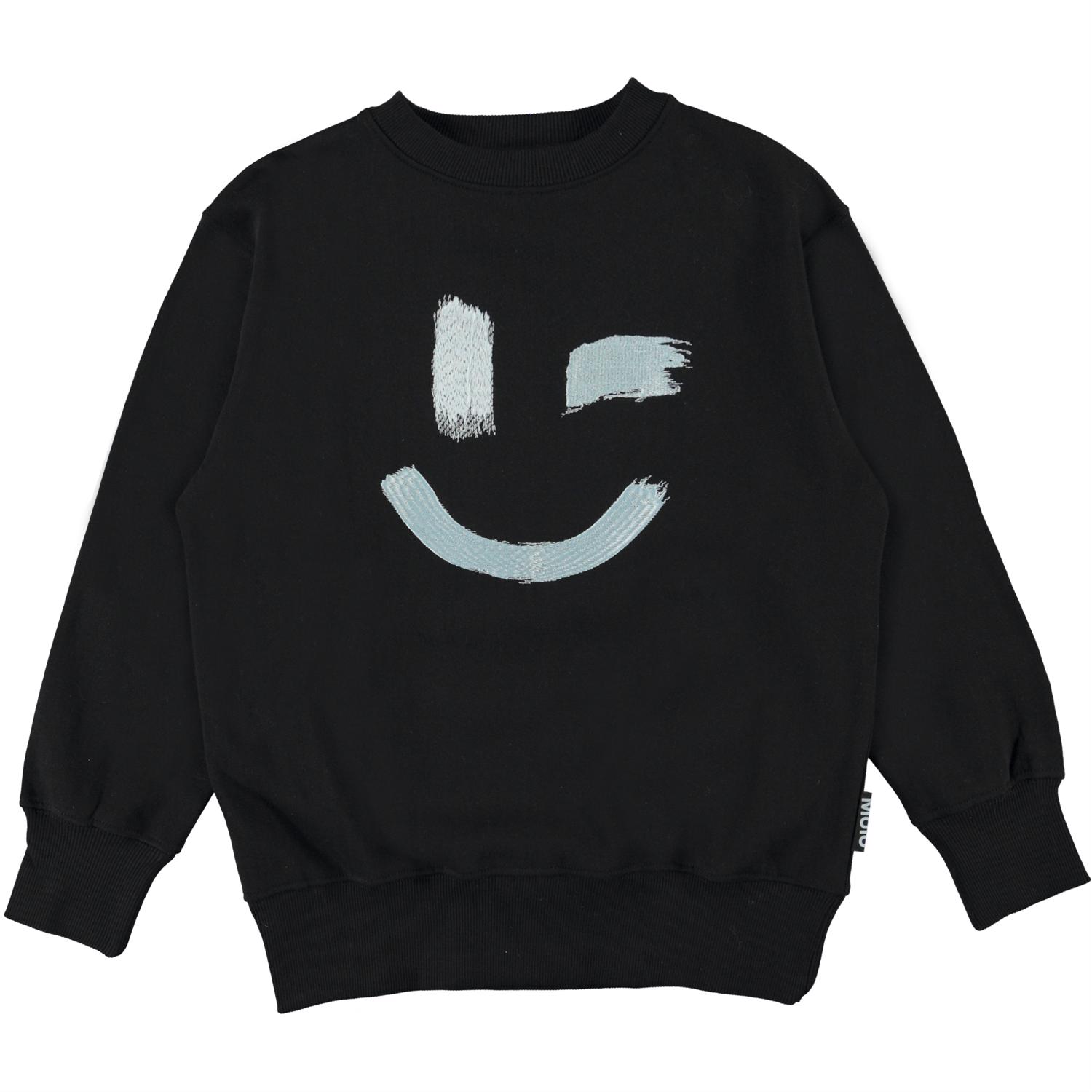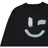 Mattis is een zwarte unisex sweater met een print van een smiley face op de voorkant. De trui heeft een ronde hals. Draag de sweater met de bijpassende broek.