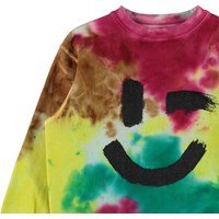Mattis is een unisex sweater in een kleurrijke tie-dye print met een smiley face op de voorkant. De trui heeft een ronde hals. Draag de sweater met de bijpassende broek.