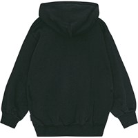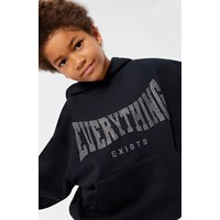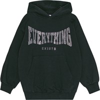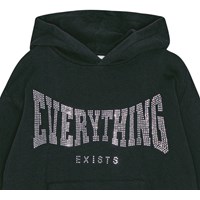 Zwarte biologische katoenen hoodie met een gevoerde binnenkant voor een zacht en warm gevoel. De hoodie heeft een oversized pasvorm, een capuchon, een kangoeroezak, geribbelde manchetten en zoom, en artwork in pailletten aan de voorkant met de tekst "Everything Exisist".