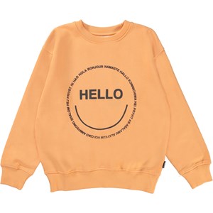 Memphis is een oranje unisex trui met op de voorkant een print van een smiley en de tekst ‘Hello’.
