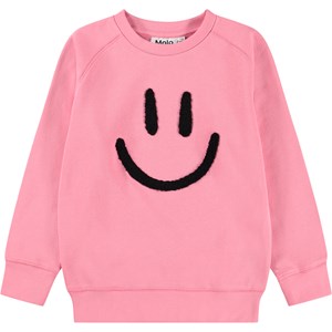 Roze sweater gemaakt van zacht biologisch katoen met raglanmouwen en ribboorden rond de hals, mouwen en taille. De sweater heeft een ruimvallende pasvorm met op de voorkant een zwarte en zachte geborduurde glimlach.