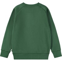 Groen sweater gemaakt van zacht biologisch katoen met raglanmouwen en ribboorden rond de hals, mouwen en taille. De sweater heeft een ruimvallende pasvorm met op de voorkant een witte en zachte geborduurde glimlach.