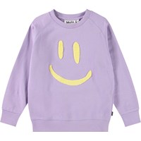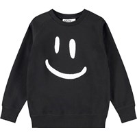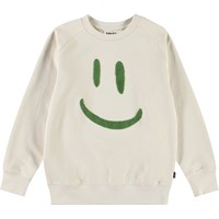 Gebroken witte sweater van zacht biologisch katoen met raglan mouwen en ribboord rond de hals, mouwen en onderkant. De sweater heeft een ruimvallende pasvorm en op de voorkant een groene zachte geborduurde smiley. Voor een complete set combineer je het met de bijpassende shorts.