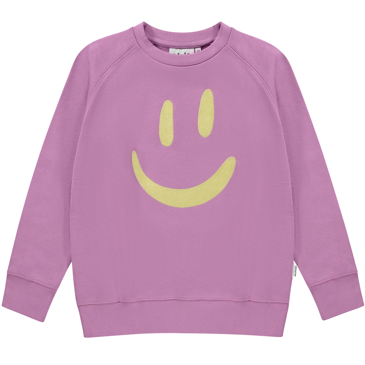 Paarse sweater met op de voorkant een geborduurde groot geel lachend gezicht.. Deze sweater is van 100% katoen en heeft raglanmouwen, een ronde hals met ribboord en ribboord aan de mouwen en onderkant. Het heeft een normale pasvorm.
