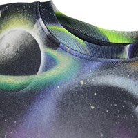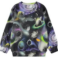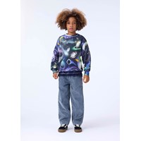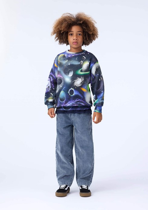 Kleurrijk sweater gemaakt van zacht biologisch katoen met een ruimteprint. De sweater heeft ribboorden rond de hals, mouwen en taille. De sweater heeft een ruimvallende pasvorm.