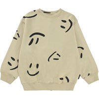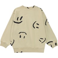 Beige sweater met een zwarte print van grote gezichten die de hele dag blij zijn. Deze sweater is van 100% katoen, heeft een ronde hals met een ribboor, ribboord aan de mouwen en onderkant en het heeft een ruimvallende pasvorm. Voor de perfecte set draag je de sweater met de Adan joggingbroek die dezelfde print heeft.