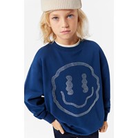 Donkerblauwe sweater van biologisch katoen met een gevoerde binnenkant waardoor het zacht en warm is om te dragen. De sweater heeft een ruime pasvorm, een ronde hals, geribbelde boorden, en een kunstwerk van een smiley in pailletten aan de voorkant, dat sprankelt en glinstert.