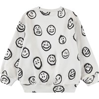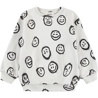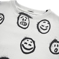 Gebroken witte sweater gemaakt van zacht biologisch katoen met een print van gezichten in verschillende stemmingen. De sweater heeft ribboorden rond de hals, mouwen en taille. De sweater heeft een ruimvallende pasvorm. Combineer het met de bijpassende shorts.
