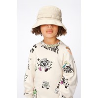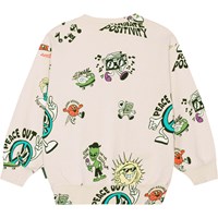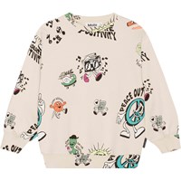 Zandkleurige sweater van zacht biologisch katoen. Het heeft ribboorden rond de hals, mouwen en onderkant. Het heeft een ruimvallende comfortabele pasvorm. De sweater heeft een kleurrijke print van leuke stripfiguren, zoals een koele zon, een buitenaards wezen dat een ijsje eet en een dansende speaker die voor een heerlijke zomerse sfeer zorgt.