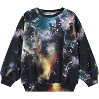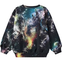 Kleurrijke sweater van biologisch katoen met een gevoerde binnenkant, waardoor het zacht en warm is om te dragen. De sweater heeft een ruimvallende pasvorm, een ronde hals en geribbelde manchetten en zoom. De all-over print is geïnspireerd op een afbeelding van de James Webb Space Telescope en toont de ruimte. Als je goed kijkt, kun je misschien wat zwevende satellieten zien.