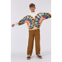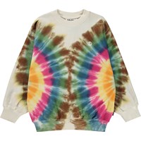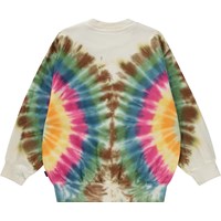 veelkleurige sweater met een tie-dye print die vanaf de zijkanten doorloopt naar de voor- en achterkant. Het heeft op de voorkant ook een kleine print van een peace teken. Deze sweater is van 100% katoen en heeft een ronde hals met een ribboord en ribboord aan de mouwen en onderkant. Het heeft een ruimvallende pasvorm. Voor de perfecte set draag je de sweater met de Adan joggingbroek die dezelfde print heeft. De tie-dye print van Molo is uniek en handgemaakt, waardoor de print per stijl kan verschillen.
