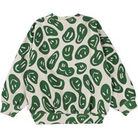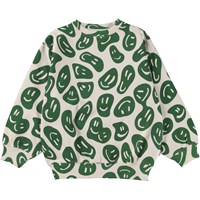 Witte sweater met een groene print van veel blije smiley’s die rondzweven en uitgerekt en opnieuw gevormd worden. Kijk of je het hart kunt vinden. Deze sweater is van 100% katoen, heeft een ronde hals met een ribboord en ribboord aan de mouwen en onderkant. Het heeft een ruimvallende pasvorm. Voor de perfecte set draag je deze sweater met de Adan joggingbroek die dezelfde print heeft.