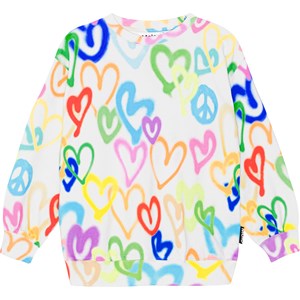 Witte sweater van biologisch katoen met een kleurrijke hartjesprint. Het heeft een ronde hals, verlaagde schouders, lange mouwen en ribboorden rond de hals, mouwen en onderkant.