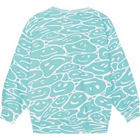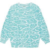 Biologische sweater in turquoise en wit met een print van smiley's die samensmelten. Het heeft een ronde hals met ribboord rond de mouwen en onderkant. Het heeft een comfortabele en ruimvallende pasvorm.