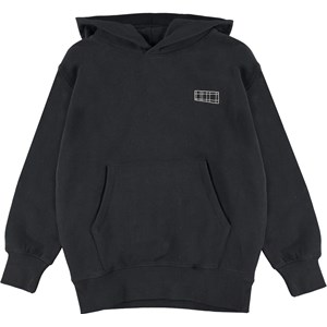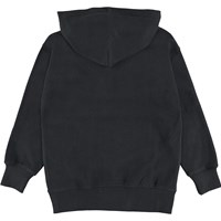 Moz is een zwarte unisex hoodie met op de voorkant zakken en een witte logo op de linkerkant. Moz heeft een ribboord aan de mouwen en onderkant.