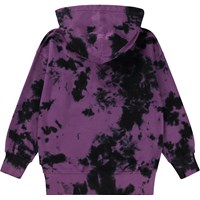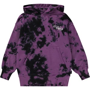 Paarse met zwarte hoodie in een tie-dye print. De hoodie heeft ook een kleine witte print op de voorkant met de tekst "Out of this World". Deze hoodie is van 100% katoen en heeft een buidelzak, ribboord aan de mouwen en onderkant en een ruimvallende pasvorm. De tie-dye print van Molo is uniek en handgemaakt, wat betekent dat het van stijl tot stijl kan verschillen.