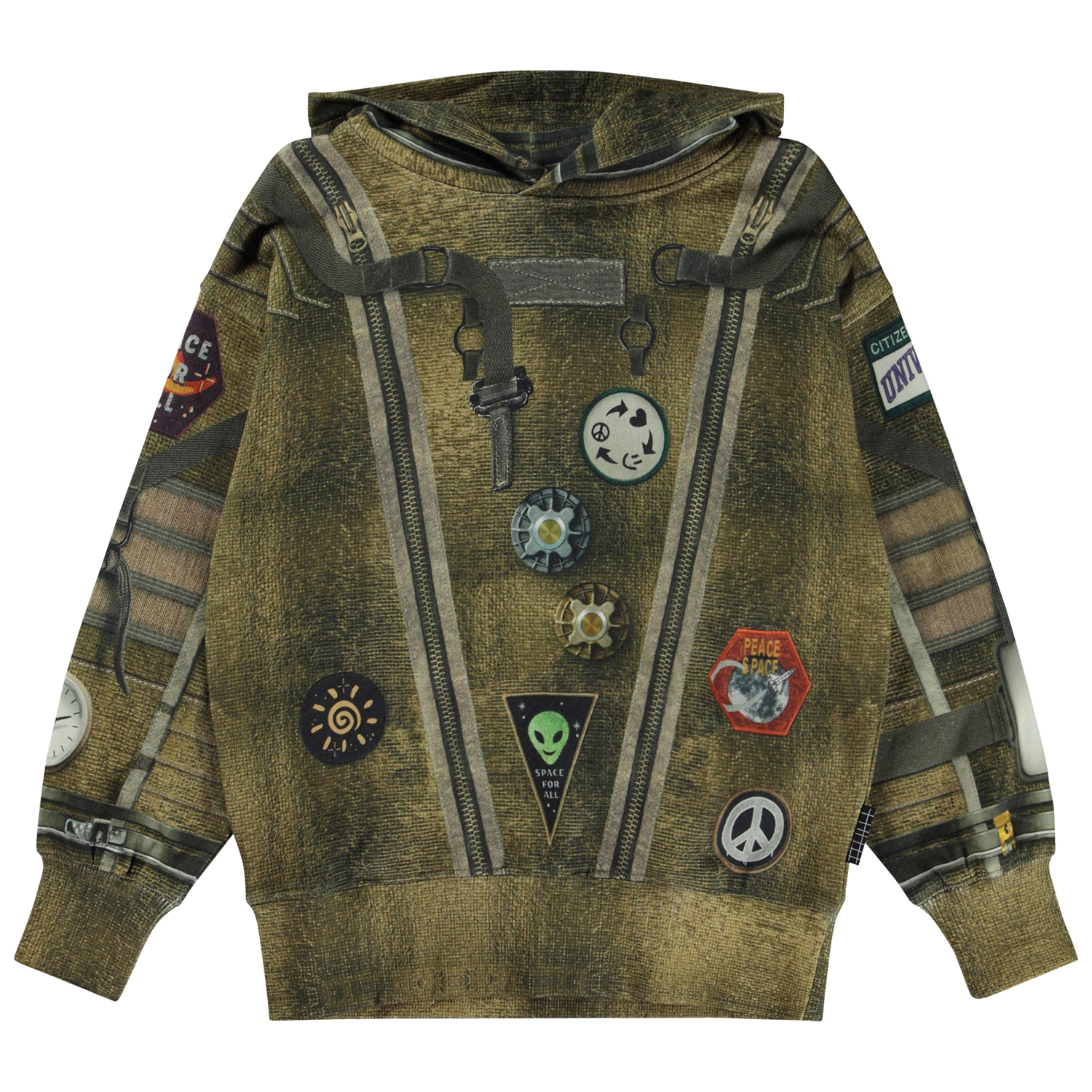 Bruine hoodie met een print van een ruimtepak met in een retro draai. Door de warme metallic look zie je eruit alsof je een harnas draagt, als een ruimteridder in het heelal Deze hoodie is van 100% katoen en heeft een buidelzak, ribboord aan de mouwen en onderkant en een ruimvallende pasvorm. Voor de perfecte set draag je de hoodie met de Am joggingbroek die dezelfde print heeft.