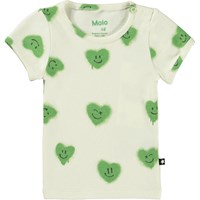 Voor kleine kinderen een lichtblauwe t-shirt van biologisch katoenen jersey. Het heeft een aansluitende pasvorm, smalle ribboorden rond de mouwen en hals en twee drukknopen op de linkerschouder. Het t-shirt heeft een print van turquoise pompoms met donkerblauwe smileys.