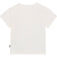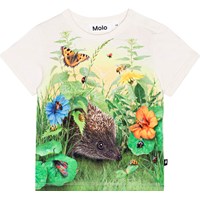 Gebroken witte baby t-shirt van biologisch katoenen jersey. Het t-shirt heeft een aansluitende pasvorm, een smalle boord rond de mouwen en hals en twee drukknopen op de linkerschouder. Het t-shirt heeft op de voorkant een print van een lief egel en insecten in het groene gras.