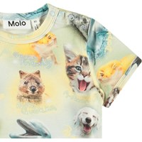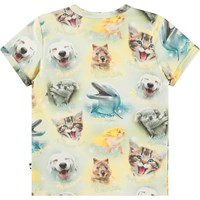 T-shirt voor de kleintjes van biologisch katoen. Het t-shirt heeft een aansluitende pasvorm, smalle ribboorden aan de mouwen en hals en drukknopen op de linkerschouder, waardoor het gemakkelijk aan te trekken is. Het t-shirt heeft een all over print van dieren die blij zijn. Combineer het met de bijpassende Sammy broek voor een complete outfit.