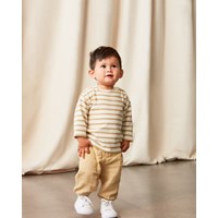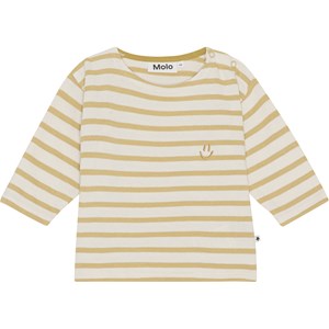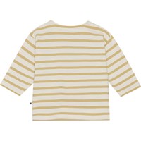 Edarko is een gouden-wit Bretons gestreept babyshirt. Het shirt heeft lange mouwen en op de borst een geborduurde smiley.