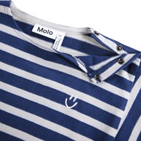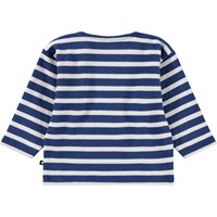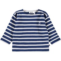 Gestreepte longsleeve voor de kleintjes gemaakt van biologisch katoen. De longsleeve heeft blauwe strepen en op de borst een kleine witte lachende gezichtje geborduurd. Het heeft een ruimvallende pasvorm en een ronde hals met drukknopen op de linkerschouder om het gemakkelijk aan en uit te kunnen trekken.