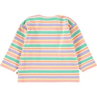 Longsleeve voor de kleintjes gemaakt van biologisch katoen. De longsleeve heeft veelkleurige strepen en op de borst een kleine witte lachende gezichtje geborduurd. Het heeft een ruimvallende pasvorm en een ronde hals met drukknopen op de linkerschouder om het gemakkelijk aan en uit te trekken.