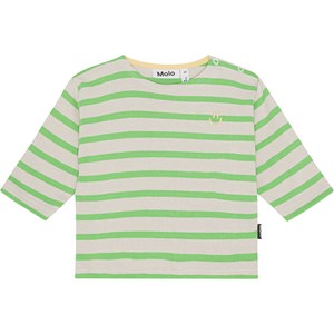 Voor kleine kinderen een gestreept shirt met lange mouwen van zacht biologisch katoen. Het shirt heeft een ronde hals met een ribboord, een ruimvallende pasvorm en twee drukknopen op de linkerschouder. Het heeft groene en zandkleurige strepen en op de borst een kleine gele geborduurde smiley.