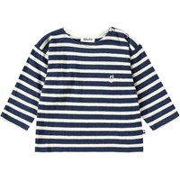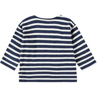 Voor baby's en peuters een blauw-wit gestreept biologisch longsleeve met een kleine, witte smiley geborduurd op de borst. De longsleeve heeft een ruime pasvorm en een ronde hals met twee drukknopen op de linkerschouder, waardoor het gemakkelijk aan en uit te trekken is.