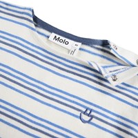 Longsleeve voor de kleintjes gemaakt van biologisch katoen. De longsleeve heeft blauwe strepen en op de borst een kleine blauwe lachende gezichtje geborduurd. Het heeft een ruimvallende pasvorm en een ronde hals met drukknopen op de linkerschouder om het gemakkelijk aan en uit te trekken.