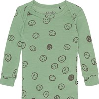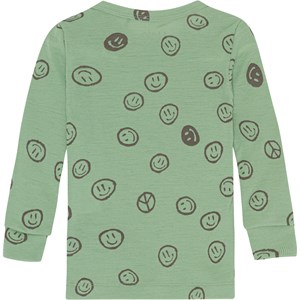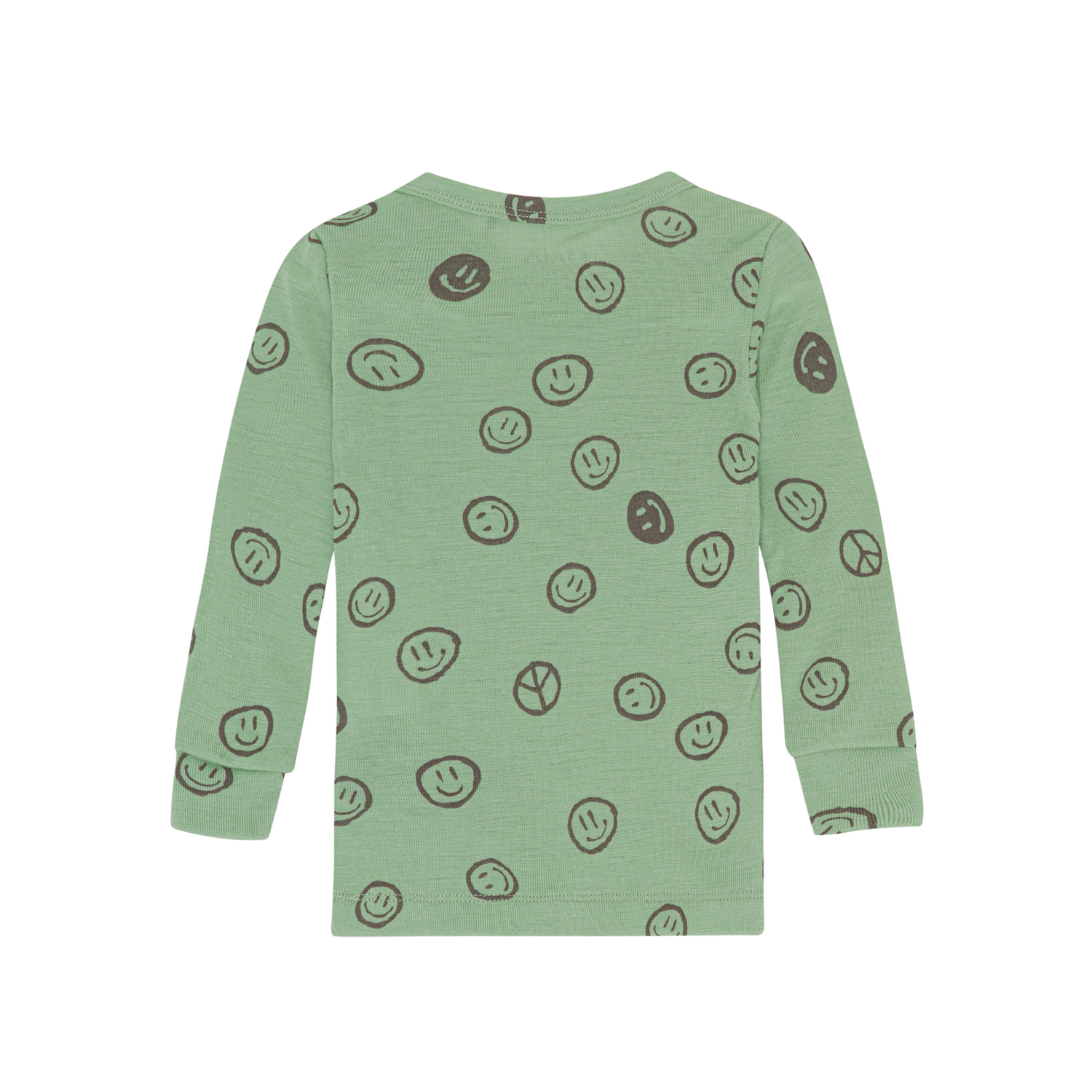 Voor de kleine kinderen een groene topje met lange mouwen met een print van kleine smiley’s and peace tekens. Deze top is van 100% merinowol en heeft lange mouwen. Draag het met de Sting broek die dezelfde print heeft.