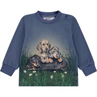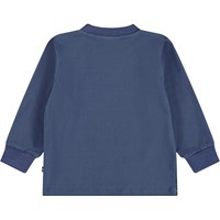 Donkerblauwe longsleeve voor de kleintjes gemaakt van biologisch katoenen jersey. Op de lange mouwen staat een print van een teckel. De longsleeve biedt goede flexibiliteit en heeft ribboorden. Het heeft ook twee drukknopen op de linkerschouder om het gemakkelijk aan te trekken.