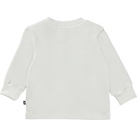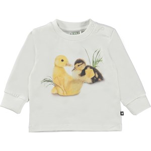 Eloy is een witte babytrui met op de voorkant een print van kleine, lieve en zachte eendjes. Eloy heeft twee drukknopen op één schouder.