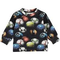 Eloy is een zwarte babysweater met een print van kleurrijke voetballen. Eloy heeft drukknopen op een schouder.