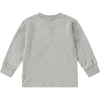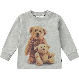 Voor baby's en peuters een grijze gemêleerde longsleeve van biologisch katoenen jersey. De longsleeve geeft veel bewegingsvrijheid en heeft geribbelde boorden. Het heeft ook twee drukknopen op de linker schouder, waardoor het gemakkelijk aan te trekken is. Op de voorkant van de blouse staat een print met twee teddyberen.