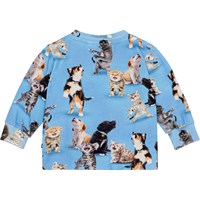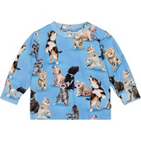 Voor kleine kinderen een blauw shirt van biologisch katoen jersey met een honden en poezenprint. Het shirt is comfortabel, heeft een ruimvallende pasvorm en is gemakkelijk aan te trekken door de drukknopen op de schouder.