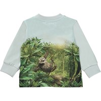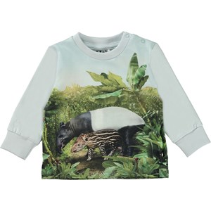Eloy is een lichtblauwe babytrui met op de voorkant een print van twee tapirs en een luiaard. Eloy heeft twee drukknopen op één schouder.