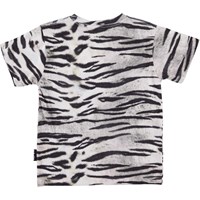 Rasmus is een baby t-shirt van biologisch katoen met een zwart witte tijgerprint. Het t-shirt heeft drukknopen op één schouder en een geprint geel Panthera-logo op de borst.