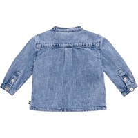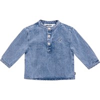 Voor kleine kinderen een blauwe spijkerblouse van biologisch katoen. De blouse heeft een mandarijn kraag en een sluiting met drie witte knopen. Het heeft een comfortabele ruimvallende pasvorm. De achterkant van de mouwen heeft een knoopsluiting en de blouse heeft een plooi aan de achterkant om het ruimer te maken. De blouse heeft op de borst een geborduurde smiley.