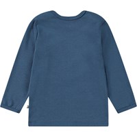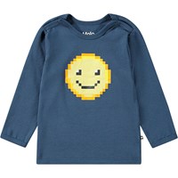 Voor baby's en peuters een donkerblauwe longsleeve van biologisch katoenen jersey. De longsleeve heeft drukknopen bij de hals, waardoor hij gemakkelijk aan en uit te trekken is. Op de voorkant staat een geplaatste print van een vrolijke pixel emoji.