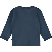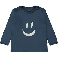 Donkerblauw topje voor de kleine kinderen met een print op de voorkant. De print is een lachend gezicht in lichtgrijs. Deze top is van 100% katoen, heeft lange mouwen en drukknopen op de schouder. Draag het met de Sting broek die dezelfde kleur heeft.