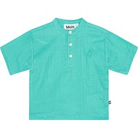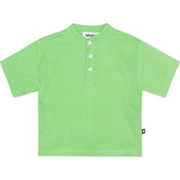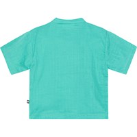 Voor kleine kinderen een turquoise t-shirt van biologisch katoen. Het heeft een mandarijnkraag, een sluiting met drie witte knopen en een ruimvallende pasvorm, zodat het uiterst comfortabel en gemakkelijk aan te trekken is. Op de borst is, in dezelfde kleur, een smiley geborduurd. Voor een complete set kun je het t-shirt dragen met een bijpassende broek die dezelfde kleur en stof heeft.