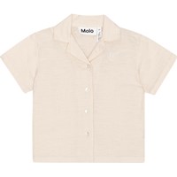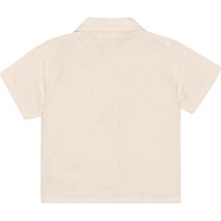 Zandkleurige linnen blouse voor kleine kinderen. De blouse heeft een kraag met een knoopsluiting van parelmoerkleurige knopen, zodat het gemakkelijk is aan te trekken. Het heeft een klein geborduurde smiley op de borst. Voor een complete set kun je het dragen met een korte broek die dezelfde kleur en stof heeft.