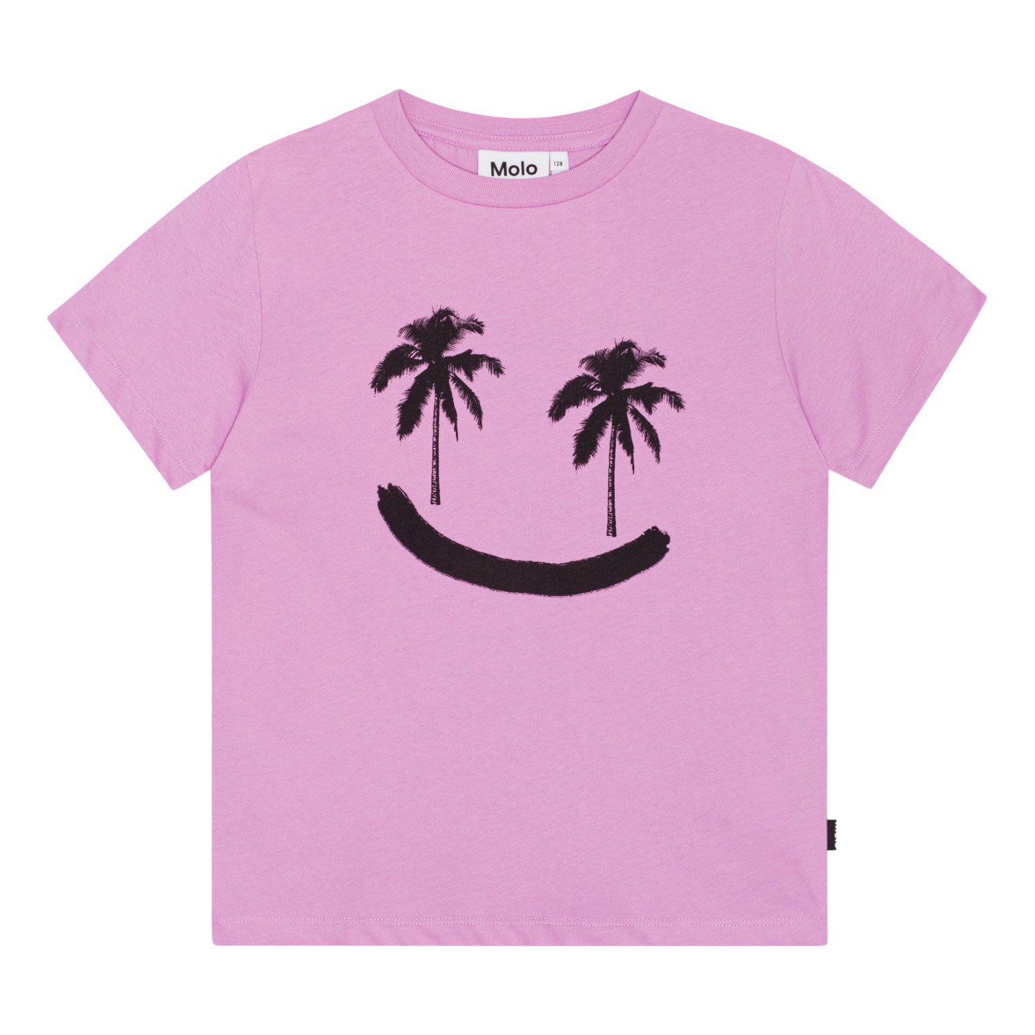 Voor kleine kinderen paarse t-shirt van biologisch katoen. Het heeft een klassieke ruimvallende pasvorm met een ronde hals met ribboord. Het t-shirt heeft op de voorkant een zwarte print van een smiley met palmbomen als ogen.
